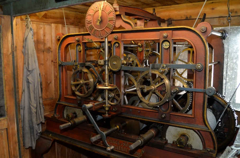 Im Turm, unterhalb der Glocken, arbeitet das mechanische Uhrwerk noch in seinem Originalzustand von 1906. Damit gehört es zu den ganz seltenen noch funktionsfähigen Exemplaren seiner Art.