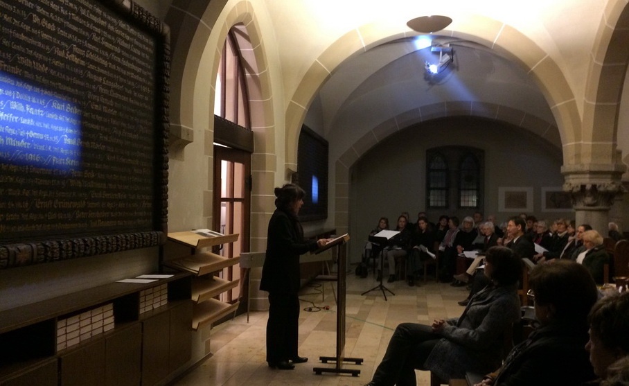 Normalerweise schauen Sie als Gottesdienstbesucher nach vorne zum Altarraum und zur Kanzel, für unsere heutige Veranstaltung haben wir Stühle und Bänke gedreht. Wir wollen zurückschauen – im doppelten Sinne – wir wollen uns der Kriegsjahre 1914-1918 erinnern und wir wollen dabei hier unsere Gedenktafeln in den Blickpunkt nehmen. Im Alltag finden diese Tafeln wenig Beachtung. Heute wollen wir sie ins Zentrum unseres Lichtprojektes rücken.