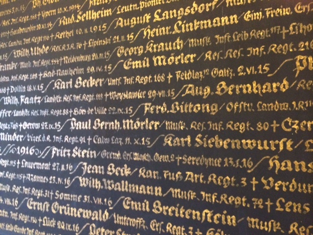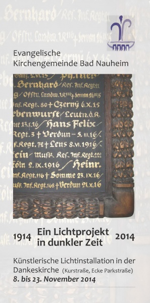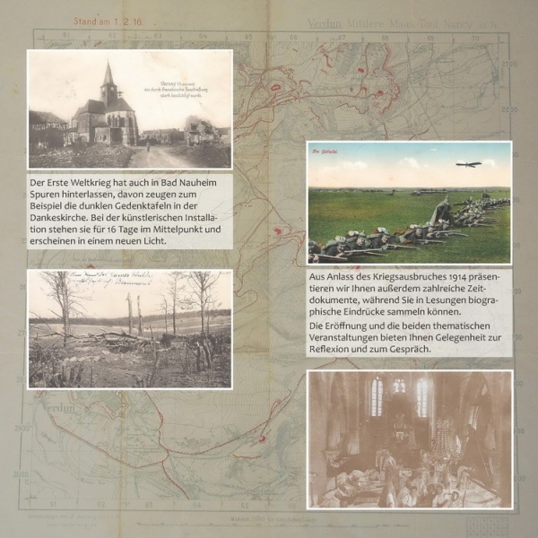 "In diesem Jahr jährt sich der Ausbruch des 1. Weltkrieges zum 100. Mal. Im Sommer 1914 brachte das Attentat von Sarajevo das Pulverfass Europa zur Explosion. Ein Krieg, der die alte Weltordnung für immer veränderte – die Uhr Katastrophe des 20. Jahrhunderts. Doch wie erlebten einfache Menschen, junge Soldaten und ihre Familien diese Zeit? Welche Spuren hat der 1. Weltkrieg in Bad Nauheim hinterlassen? In der Dankeskirche zeugen die dunklen Gedenktafeln aus Eichenholz an der Rückwand vom 1. Weltkrieg.